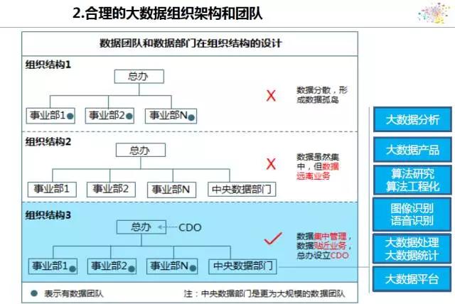 首先要设立一个中央级的数据部门,第二是每个事业部里面都有数据团队,他们分工是有差异的。