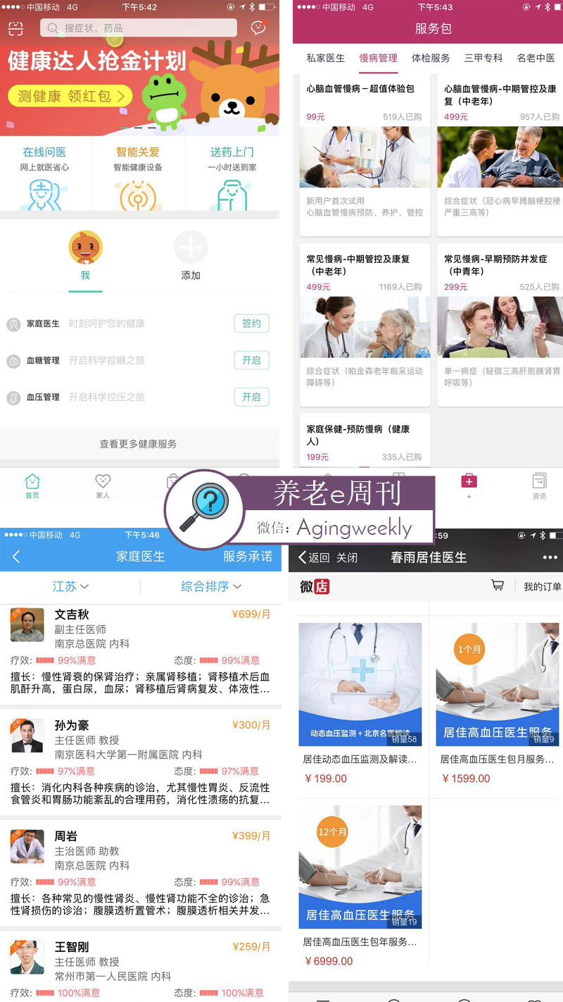 上面是Agingweekly收集到典型的进家健康管理服务,我们可以看到在价格上服务费是99元-1599元/月,提供的服务主要包括了2-4次电话远程问诊、不限次的线上交流、不定期用药/饮食/运动/病症指导(如有线电视/在线视频/公众号文章等)——对应生成1次月度健康评估报告和建议,共享给家人。价格稍高的还包括了1次上门问诊,或配套的体征测试智能硬件。