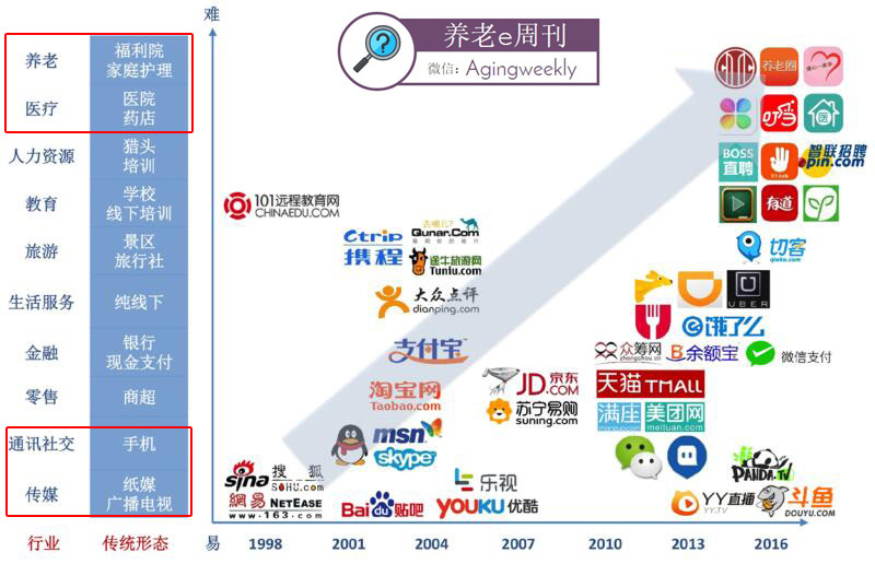 从互联网+对行业的程度来看,“进入门槛越低、标准化程度越高“,则互联网对传统行业的渗透率越高,而医疗、养老等领域因为相对封闭且高度非标准化,互联网+的历程尚处于起步阶段。