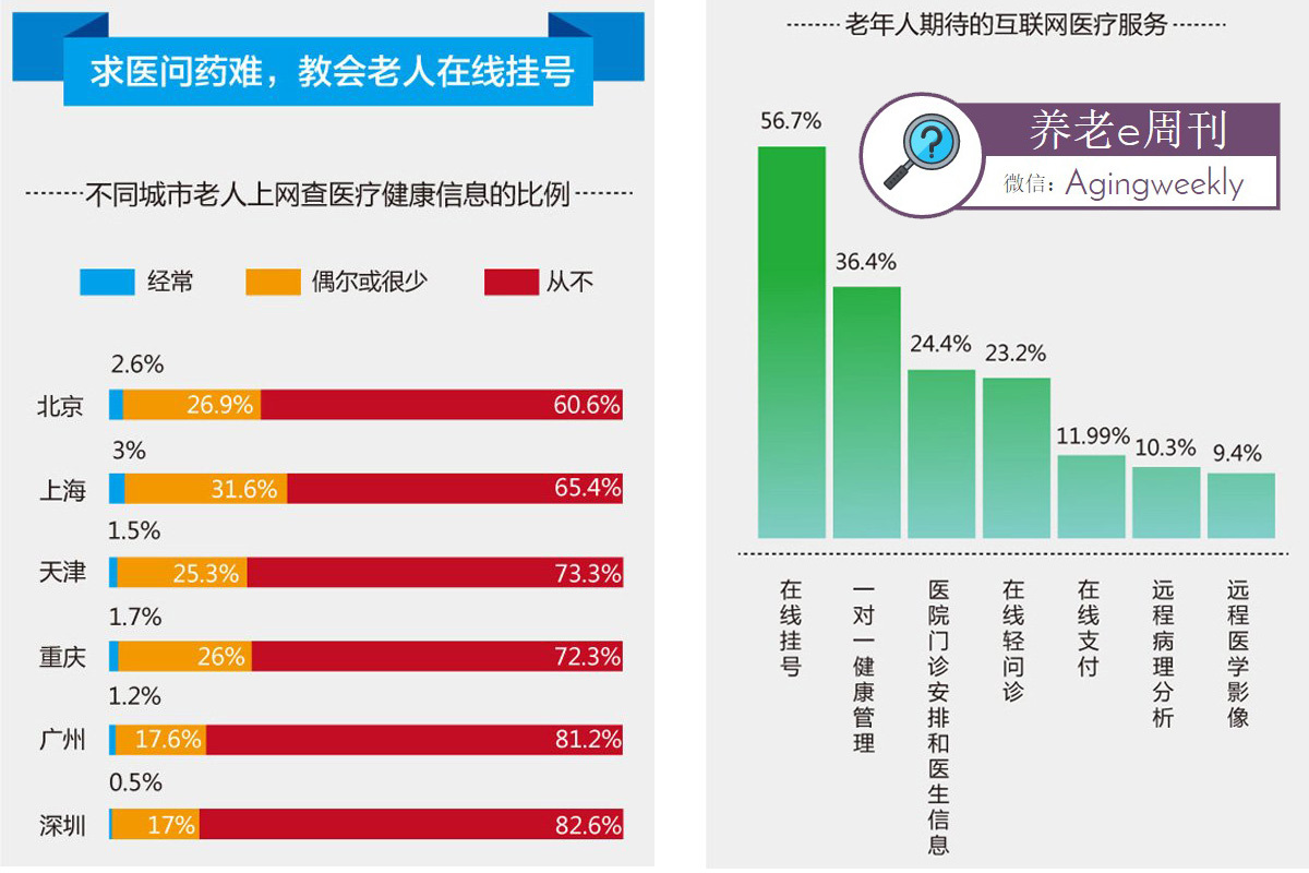 根据社科院与腾讯在2017年2月联合发布的《生活在此处——社交网络与赋能研究报告》,我们看到老年网民在最需要的网络医疗信息是在线挂号(56.7%)和一对一健康管理(36.4%),但从典型一二线大城市数据看,60%-80%+的老年人从未在网上查询过医疗服务和信息。