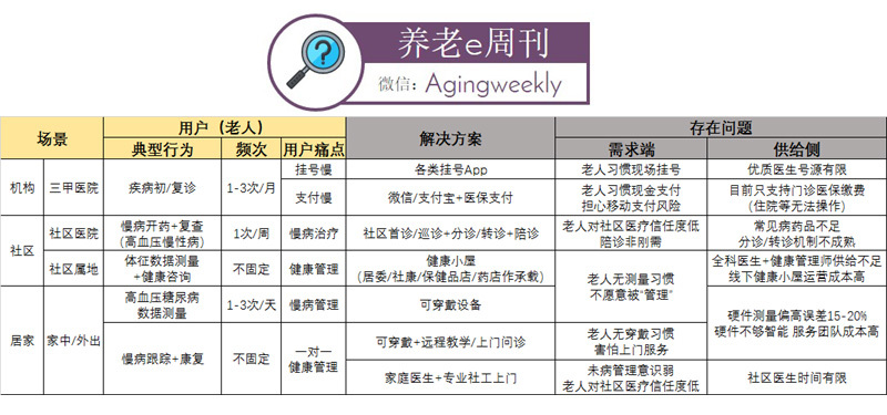 对照来看,上图是Agingweekly梳理出在机构(指医院)、社区、居家三类场景中,老人典型的健康行为和既有的解决方案,从商业的角度来说,满足“更高频次、更刚性的需求、更明显的痛点”是更优的切入点选择。但老人受限于“健康管理意识弱(不愿意发现和承认得病)、可支配收入低(医保之外要留养老钱,不病不花,得病乱花)、移动互联网属性缺失(畏惧移动挂号、问诊、医疗、医保支付)”等因素,移动互联网带来的效率和成本改变很难体现。