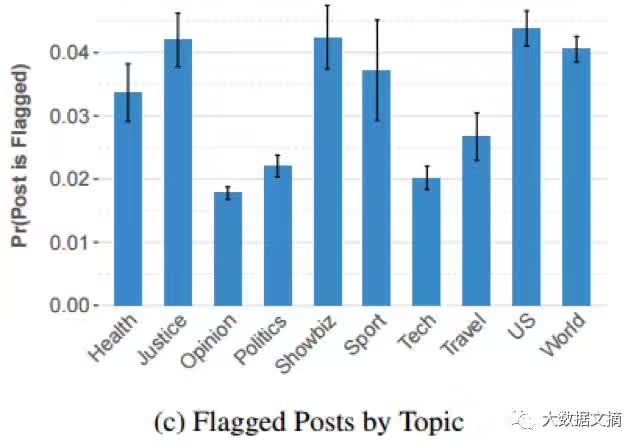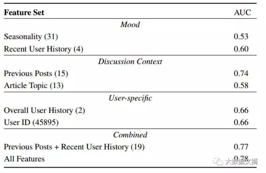 结果显示,讨论中上一篇帖子的标记状态是下一篇帖子是否被标记的最强预测因素。 情绪相关的特征,如评论者的评论时间和以前的标记,远起不到预测的作用。 用户的历史和用户ID虽然有一点预测效果,但仍然比讨论情境提供的信息少了很多。 这意味着,虽然有些人可能总是更倾向于喷别人,我们发帖的上下文情境因素更有可能诱发喷子的怒火。