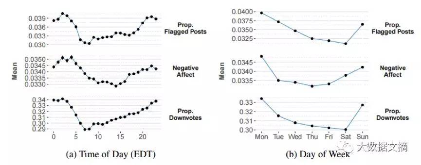 没办法直接评估评论者的心情,但是团队查看了帖子的时间戳,因为以前的研究表明,一天中的某个时刻和一周中的某天与某种心境相对应。出现拍砖及被评论的帖子这种事,与消极情绪的确定模式紧密相关。 这种事件往往在深夜和每星期之初较多,这也是人们最有可能心情不好的时候。