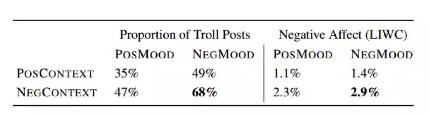 研究人员进一步调查情绪的影响,发现如果一个人以前的言论曾经被标记为喷子,或者他们参加过他人发起的被标记的帖子或者讨论,那么这个人更有可能发布被标记为喷子的帖子。 无论曾经和之后的文章有没有联系。