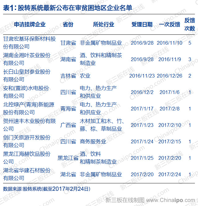 新三板在线发现,股转系统审核这些企业时,加快了受理和反馈进度。比如,2017年2月20日被受理申报材料的湖北省华建石材股份有限公司,到第四天就收到相关部门的第一次反馈意见。剑门关旅游等最新受理贫困地区企业也迅速收到了首次反馈意见。