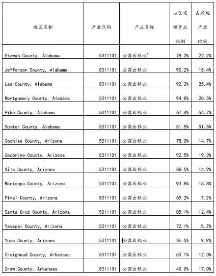 在美国各类租赁住房的供给主体中,专业化的公寓[4]出租企业是最重要的主体。从全国总体看,按行业营业收入占比计,公寓出租业占住房出租业的总体的90%以上[5]。根据表1-2,尽管不同地区的情况有一定差异,但在大部分地区公寓出租业占住房出租业的比例都在60%以上,同时可以看出,以公寓出租业为主体的住宅出租业是美国各地区房地产业中一个非常重要的行业,在很多地区,住宅出租业在当地房地产业中的占比都在20%以上,某些地区达到80%以上甚至100%。