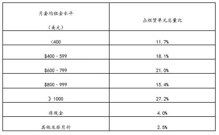 美国租赁住房租金水平差异较大,但2013年相关调查显示,54.5%的租赁住房月租金处于400-999美元之间(表1-5)。