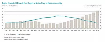 如图1-1所示,美国住房自有率从2004-2005年的历史最高点68%降到2015的63%,承租住户户数从2004年的不足3400万户一路快速上升为2015年的超出4200万户[1]。据美国住房和城市开发部有关专家估计,美国住房自有率每降低1%,大概就有120万人进入租房市场。
