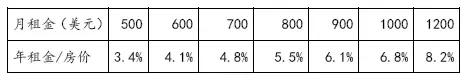 从房租与房价的比值看,目前绝大多数租赁住房的年租金/房价比处于3.4% - 8.2%区间(表1-6)。