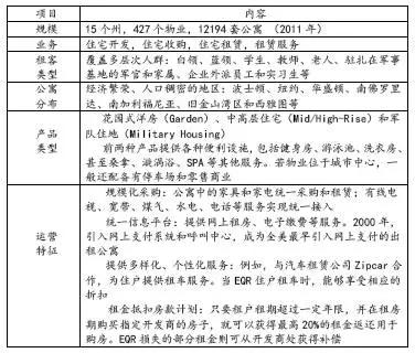 在公寓出租业中,EQR(EQUITY RESIDENTI)是美国最大的公寓租赁投资经营企业。这家1969年成立,1993年上市的公寓类REITs,2011年在美国15个州持有427处物业、12194套公寓,是住房租赁企业中的龙头老大。其服务对象、产品类型、空间分布均呈多元化态势,在经营手段和策略方面具有专业化、规模化、现代化、精细化的特征(表1-3)