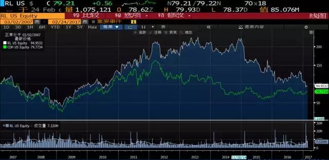 (白色为Raulph Lauren, 绿色为Coach的近 十年股价对比)