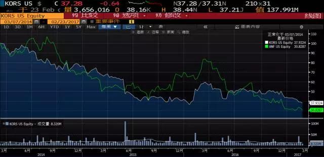(白色为MK, 绿色为A&F的近两年股价对比)