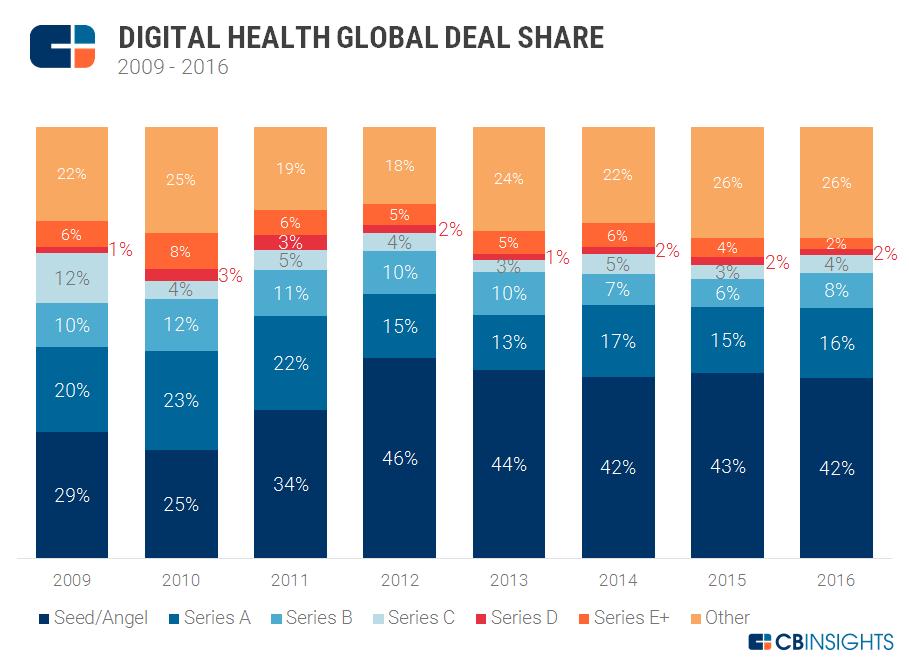 从投资阶段来说,数字健康产业越来越富有竞争性,大部分资金都投向了早期阶段的公司,包括种子轮和A轮。在2011年之前,早期阶段融资占总交易份额的50%以下,但是在2010年“平价医疗法案”通过之后,对早期数字健康公司的投资从未下降到总交易份额的56%以下。与此同时,中期投资(B轮和C轮)已经从2009年22%的高点下降到2016年的12%。D轮和E +轮的投资份额自2010年达到11%的高位后也出现下降,2016年为4%。