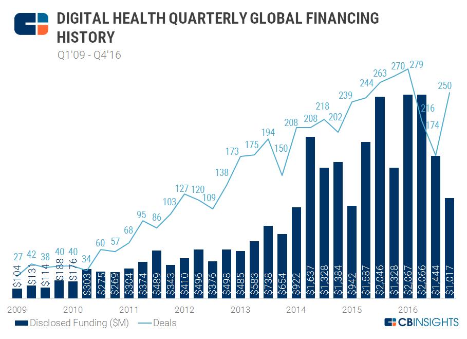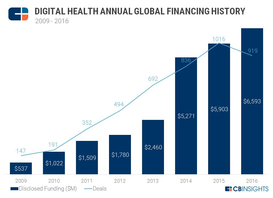 2016年,数字健康公司的股权融资额增长约12%,从2015年的59亿美元增加到近66亿美元。然而,投资交易数量却从2015年的1016笔降到2016年的919笔,下降幅度约9.5%。