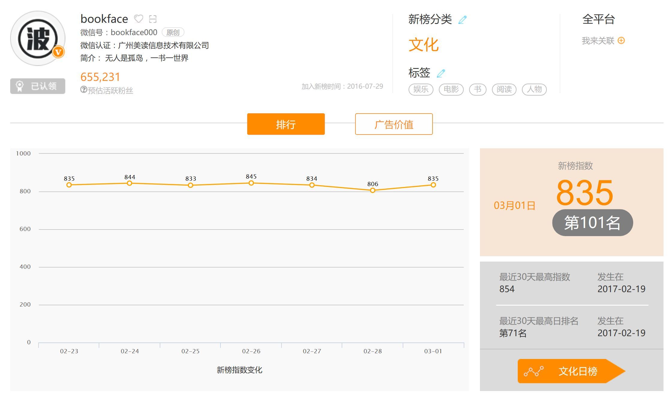 但新近的公众号bookface却做到了快速发展:该公号在2016年8月初才发布了自己的第一篇文章,随后仅用了半年时间,便在今年2月突破了百万粉丝。目前,bookface的平均阅读量已经达到了8万,最近一月三分之一文章10万+,在新榜文化类公号排名100左右,创始人吴蔚告诉36氪:“我们是目前做原创人物故事的公众号中头部的”。