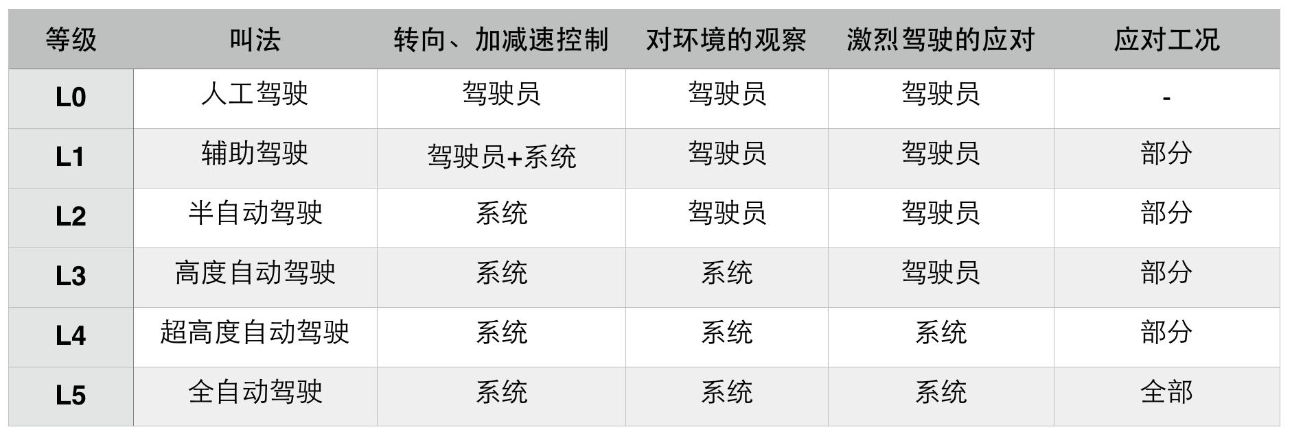 两个机构的标准都把自动驾驶分为了L0~L5,其中L0指的是人工驾驶。要注意的是,其实NHTSA早在2016年9月份,就统一采用了SAE International的分类标准。