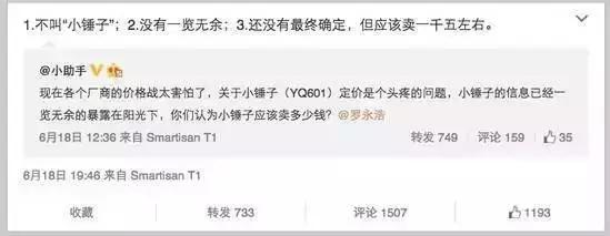 6月份罗永浩在微博发声,回应网友,称新品不叫“小锤子”,并公布价格在一千五左右。厉害了,这一简单的发声又把网友关注小锤子的热情点燃了。