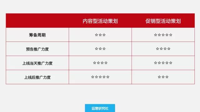 在传播上内容专题与电商促销活动策划最大的区别在于,它更注重内容上线后的传播,电商活动的成败则取决于活动上线前的蓄能效果。具体的细节区别,可看下边的这张表格,相关案例太多就不占用篇幅举例啦!