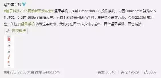 转发送手机是所有厂商屡试不爽的一种活动方式,不管有没有僵尸粉转发,单从数据上来看锤子科技每次都能够轻松的策划转发活动。