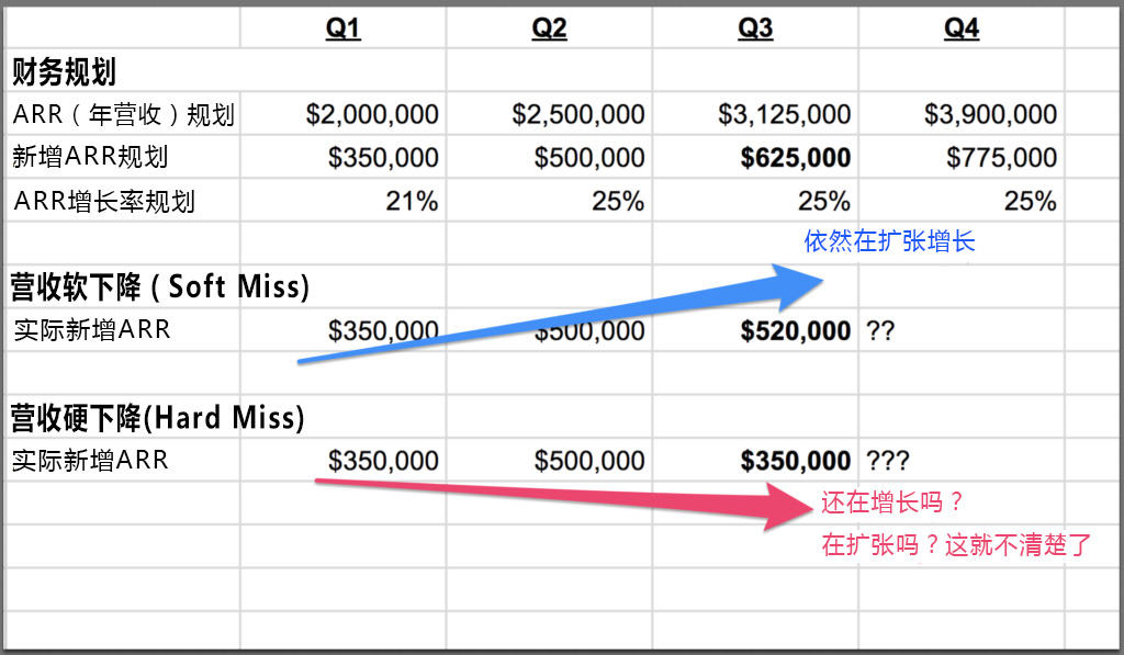 (2)第二种情况:公司本季度的新增销售额非但没达到目标,而且还没有上个季度多。这就属于“营收硬下降”(Hard Miss)问题了。