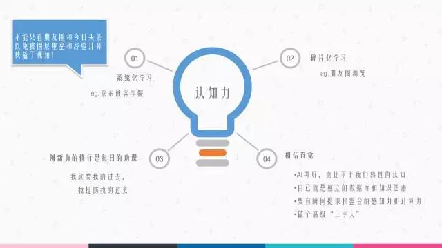 对人的感性来讲,计算能力说法有点虚无,基于自己知识系统更新的情况下,做某一个商业抉择或者跟某一个商业结合,你的感知力来自所有的内容,但是自己要懂得提取和整合,不是简单借鉴和嫁接。所以我说,做一个“高级的二手人”,没有人是一手人,我们分析自己的法宝就在这里。