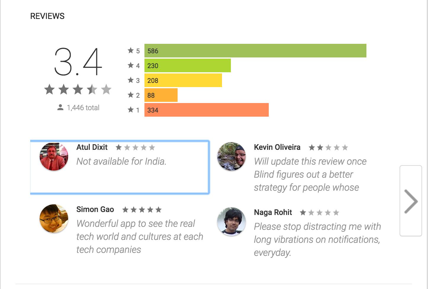 Google Play中对于Blind的评价为3.4分。其中框出的那条1星评论是在抱怨这个app并没有在印度开放。