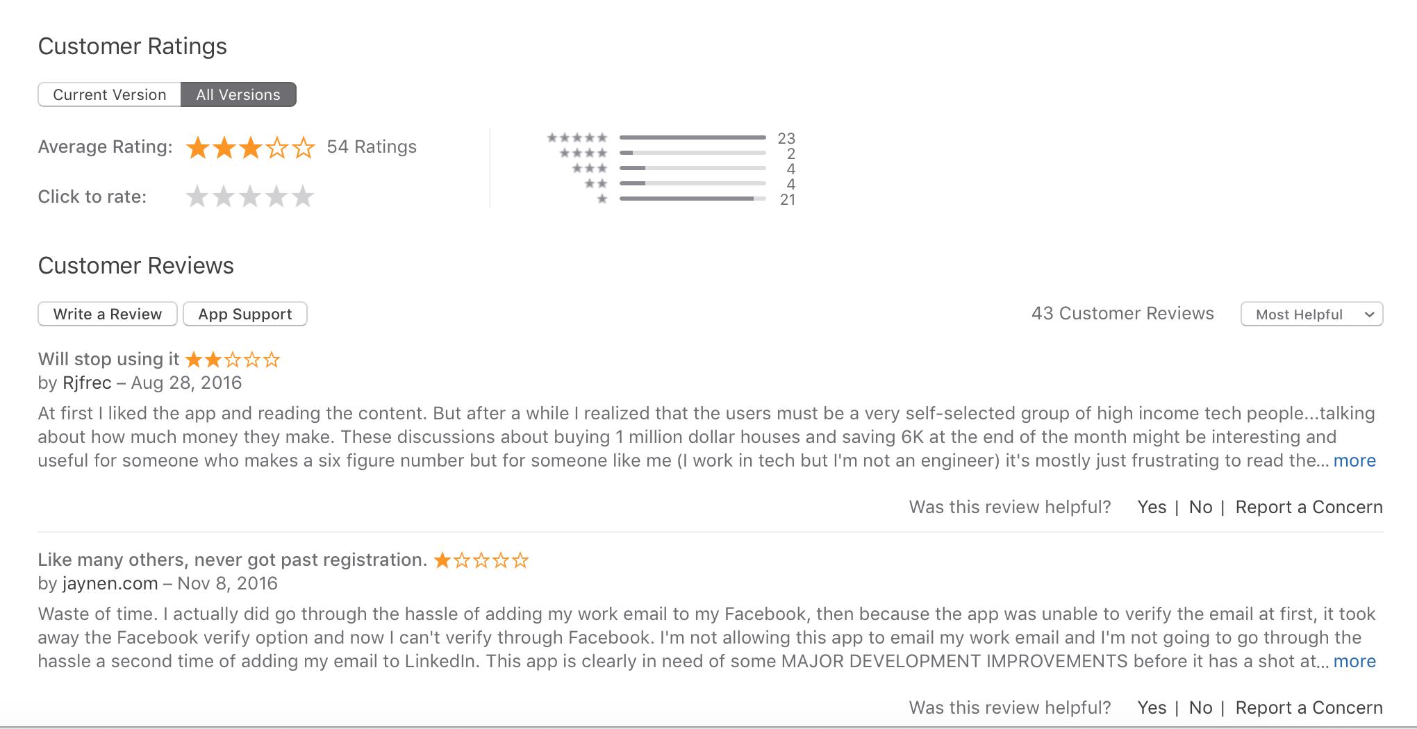 苹果应用商店对于Blind的评价为三星。其中第一条评论主要说这个app里的用户都是高收入的科技人员,不适合普通收入者。第二条评论主要说这个app浪费了用户很多时间,主要是因为他无法通过企业邮箱验证。