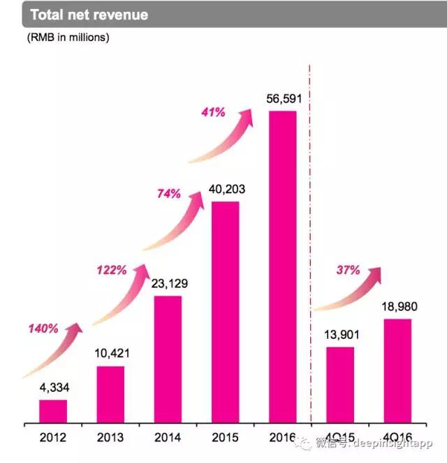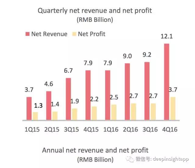四季度收入189亿,同比增长36%,但整体增速维持着环比下滑。Non-GAAP的净利润9.7亿,同比增长31%。Non-GAAP的净利润率5.1%,同比去年的5.3%继续下滑。活跃用户和总订单量分别同比增长39%和26%,达到2750万和8200万。2016全年收入达到566亿,同比增长41%,利润28亿,同比增长30%。