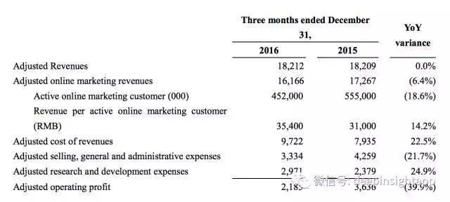 四季度收入182亿,同比下滑2.6%,剔除去哪儿的影响,实际与去年持平。收入增速是过去13年最低单季度同比增长。广告收入161亿,同比下滑8.2%,环比下滑2%。广告主环比下滑13.7%至45.2万,受魏则西事件影响,数量比二季度高峰人数减少了14.2万。Non-GAAP运营利润率16.6%,同比下滑5.6%。