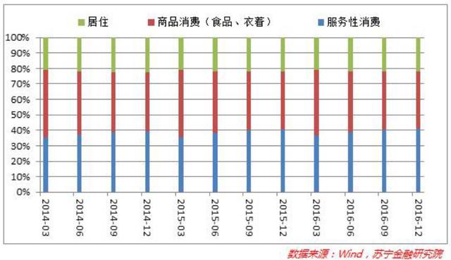 2014-2016年,城镇居民用于医疗、教育、娱乐、旅游、交通等服务性消费的支出占比由35.7%上升到41%,上升了5.3个百分点,用于居住的支出占比也上升了1个百分点,而用于商品消费(食品和服装)的支出占比由43.2%下降到36.8%,下降4.4个百分点(参见下图)。