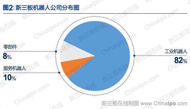其中,有5家公司的主营业务为服务机器人的生产与销售;4家公司的主营为机器人产业链上游零部件。值得一提的是,42家该类挂牌公司的主营业务为工业机器人的机体生产、集成系统与销售,占比约为82%。