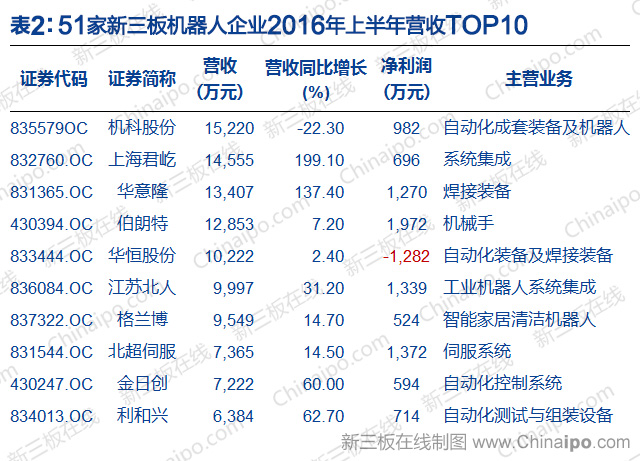 营收前十的新三板机器人公司2016年上半年营收平均为1.07亿元,增速为50.69%,归属母公司股东净利润增速约为107.12%。