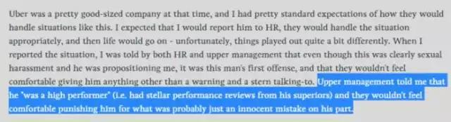 就拿性骚扰这事来说,卡拉尼克曾说过他给公司起的一个别名叫 “Boober”,因为他感觉自己特别受女性欢迎,CEO说出这样物化女性的直男癌词汇,下属性骚扰女同事就不奇怪了吧。