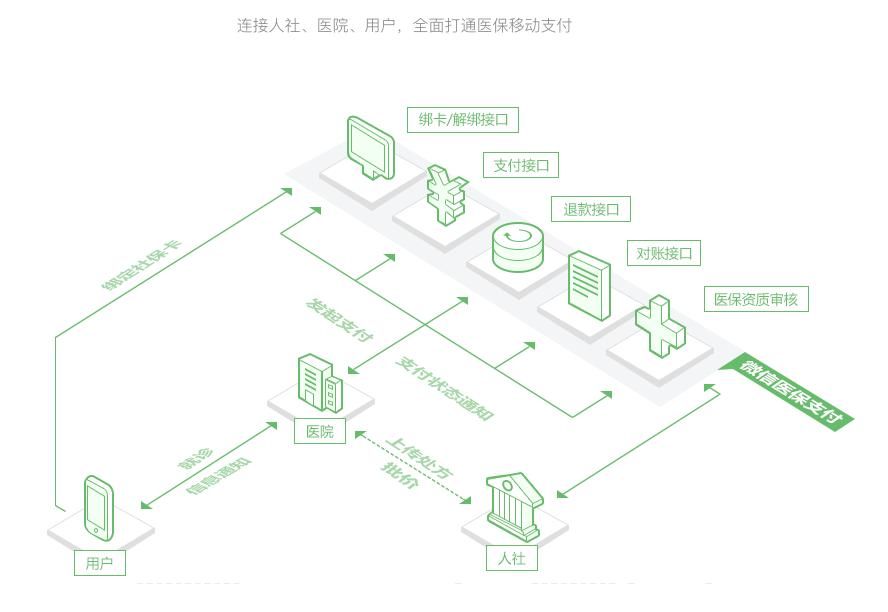 腾讯没有谈及过有关医疗的商业模式,但曾经表露过以支付为基础建立起来的生态系统:人社部门为医院开通移动医保支付权限;微信支付则接入人社部门的医保支付与结算系统,并整合到微信第三方支付中心;第三方开发者则为医院建设信息化的管理后台,对内连接医院院内信息系统,实现医保费用计算,对外连接微信支付平台。