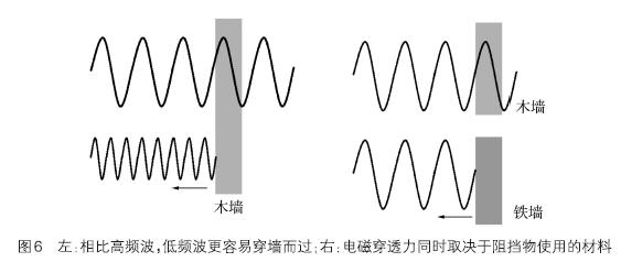 很多人认为雷达可以轻易地越过障碍物,穿透云层、墙壁和人体。这点并不完全正确。雷达是否能穿墙隔空探测物体,取决于墙本身的材料以及雷达频率的选择。首先是频率:3GHz的电磁波能穿透10cm厚的墙,而60GHz雷达如Project Soli雷达恐怕连一张薄薄的纸都无法穿透。此外墙本身的材料也很重要,同样是10cm厚的墙,如果是一般的土砖或者木头制成的,就很容易穿过,而铁墙就难以逾越(如图6所示)。