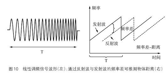 当然,发射脉冲对于发射机的峰值功率有较高要求,并且电路实现相对复杂。比较普遍的低功耗获取距离信息的方法,是对发射信号的频率做调制。此类雷达的专业术语叫作FMCW(Frequency Modulation Continuous Wave,调频连续波),操作方法是发射一个线性调频信号(chirp),其波形见图10。因为频率与距离的关系是线性的,通过检测反射波与发射波当前的频率差异即可推断物体的距离。笔者估计谷歌I/O发布的Project Soli就是一款基于FMCW的微型雷达。FMCW在目前的商用中是极其普遍的,主要源自于它对带宽要求低、功耗较低,以及电路设计相对容易实现。除此之外还有超宽频(UWB)雷达,在此就不多介绍了。