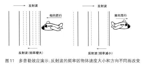 雷达的另一项优势是可以测量物体的瞬时速度,这就要提到物理中鼎鼎大名的“多普勒效应”了。其大意是说,反射波的频率会因为物体行进的速度改变而改变。一个经典的例子是有关声波的传播。远方急驶过来的火车鸣笛声因为火车速度变快而变得尖细(即频率变高),而远去的火车鸣笛声因为火车速度变慢而变得低沉(即频率变低),见图11。那么,利用此规律,只需洞悉了频率变化就可以推断物体的速度了!事实上,上面提到的FMCW雷达可以同时提取物体的距离和速度,可谓一箭双雕。具体的算法细节可以参考文献。