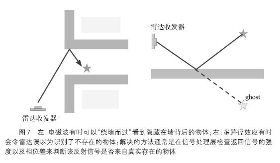 相对于穿墙,雷达波有时却可以“绕”过墙看到墙背后的物体,这其实是利用了电磁波的多次反射(Multipath,也称作多路径效应)。在某些特定的场景中,它可以成为雷达的一类特殊应用,比如利用多路径效应来检测视线不可及之处有否藏有异物。当然有时也会出现“Ghost”,也就是噪音,雷达会探测到一些根本就不存在的物体(Ghost object),这往往也是由于多路径效应造成的(如图7所示)