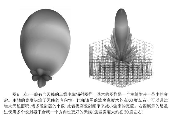 在给定发射频率情况下,天线的有向性(即波束发散角度)同天线的面积成反比。这也就能解释为什么深空探测的雷达天线要做得那么大。天线设计本身是一门非常精深的学问,我们这里的介绍只是抛砖引玉。值得一提的是,一般的有向电磁波发射的图样长得如图8所示。它通常有一个突起的主轴(main lobe)和周围的一些小突起(side lobe)。主轴的宽度决定了天线的波束宽度,而周围的小突起则一般作为噪音来处理。