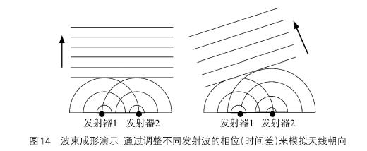 一个有效减小波束宽度的方法是使用多个电磁波发射器来合成一个窄波束的雷达,如图8右图所示。这种方法也称作波束成形(beamforming)。