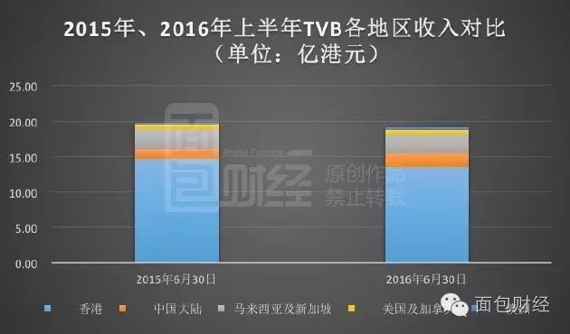 目前,TVB的收入来自香港、中国内地、马来西亚、新加坡以及美国、加拿大等地区。从其2015年和2016年上半年各地区收入对比可以看出,在香港收入显著下降,其他地区变化不大的情况下,大陆地区成了唯一的增长点。
