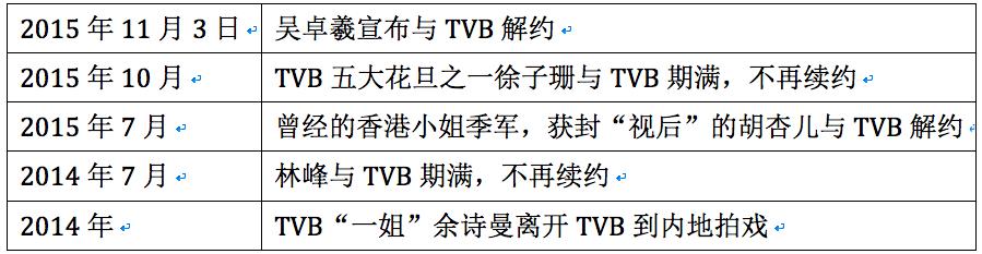 图表显示,TVB的营收和净利润下滑均始于2014年,随后两年业绩急剧下降。众多原因中,很重要的一项是旗下诸多重要艺人和制作人出走,剧集水平下降、受众流失。在2014和2015两年,光是台柱就走了不止5位。拿不出有吸引力的剧本,薪酬遭压榨、高层内部斗争成了旗下艺人出走、北上淘金的重要原因。