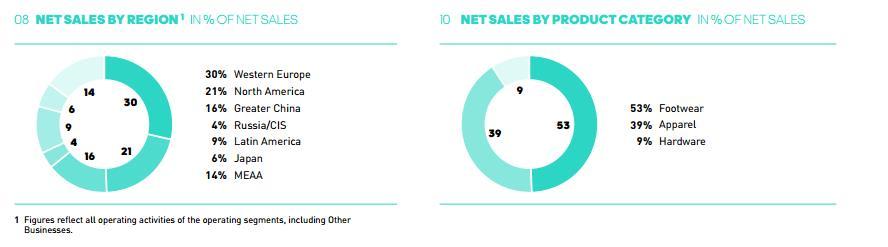 从地区上来看,阿迪达斯的欧洲大本营净销售额同比上升7.2%至52亿欧元,占整体的30%;重要的北美市场的净销售额同比增长24%至34亿欧元,占整体21%;