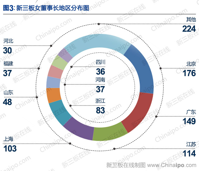 其中,北京的新三板企业女董事长最多,是176位;其次是广州149位、江苏114位和上海的103位。青海、海南、内蒙古、西藏等地区的女董事长偏少。