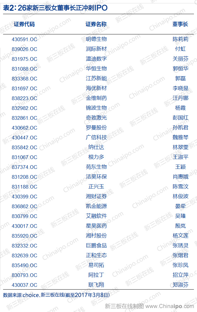 事实上,新三板在线统计发现,截至3月8日369家正在进行上市辅导的新三板企业中,26家企业董事长是女强人。