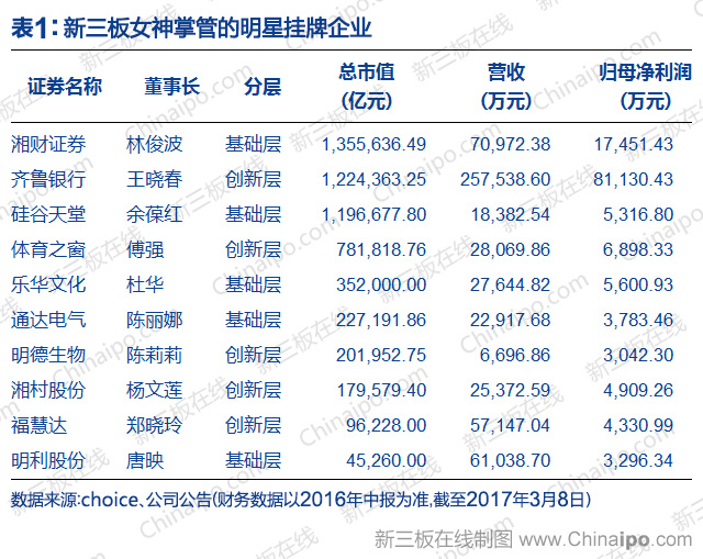 事实上,新三板在线发现,有三位女性董事长管理着百亿市值级别的挂牌企业。三家挂牌企业还属于金融行业,分别是湘财证券(430399.OC)、齐鲁银行(832666.OC)和硅谷天堂(833044.OC),截至3月8日最新市值分别是135.56亿元、122.43亿元、119.67亿元。
