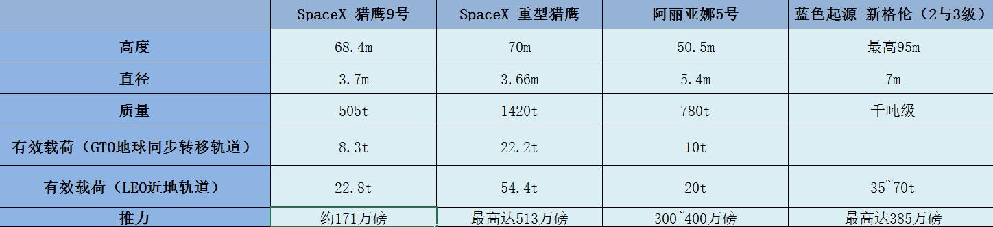 此外,你也会发现蓝色起源的新格伦号火箭与阿丽亚娜5号的运力有一定的相似性。