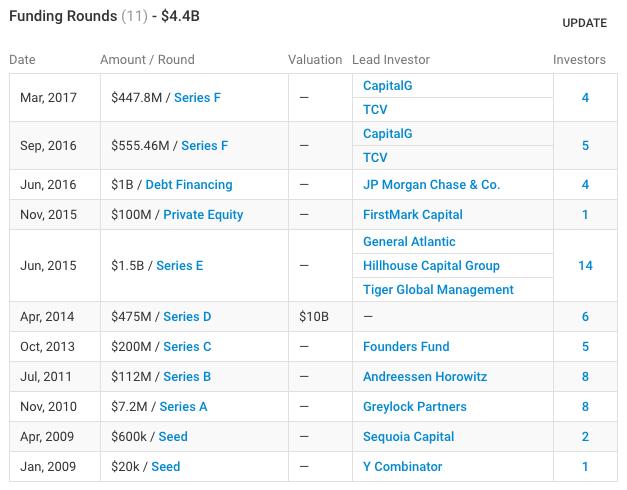 这家成立于2008年的公司,目前已经累计完成44亿美元的融资。2016年9月,Airbnb获得5.5亿美元的融资,这是10亿美元F轮融资的另一部分。该轮融资由 Google Capital和Technology Crossover Ventures 投资。