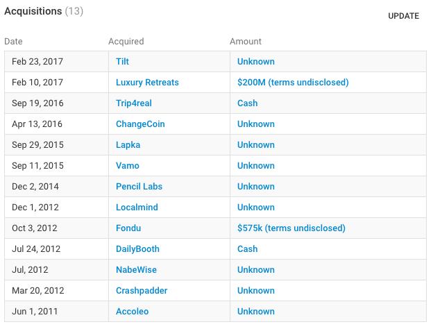 2017年1月9日,Airbnb 以1300万美元领投了餐厅预订软件 Resy 的 A 轮融资;2017年2月16日,Airbnb又以3亿美元收购了豪华度假村Luxury Retreats;2017年2月23日,Airbnb又宣布要收购支付初创公司Tilt。
