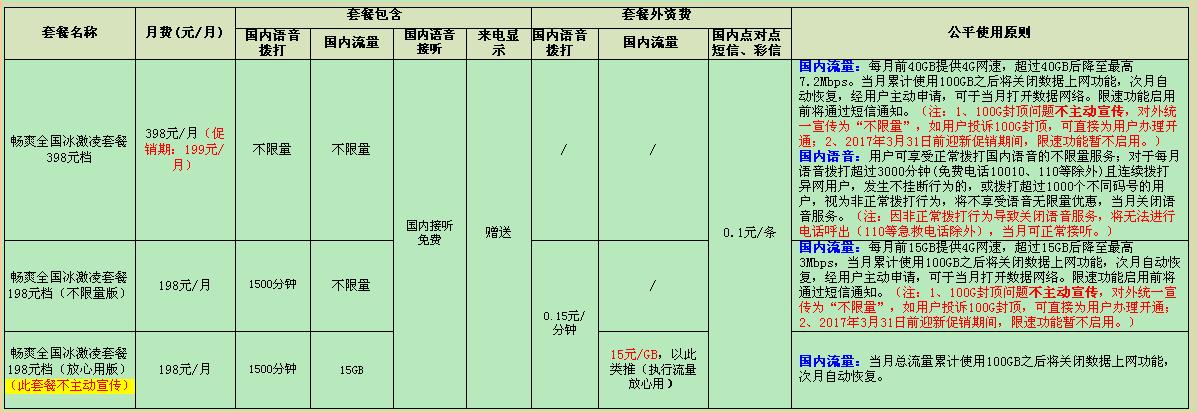 升级后的联通“冰淇淋”无限流量套餐有所提升。以 198 元档为例,每月前 15 G 提供 4G 网速,超出部分网速会降至最高 3 Mbps ,相当于 384 K/ S,约为 3G 水平。当月累计超出 100 G,则会关闭数据流量。